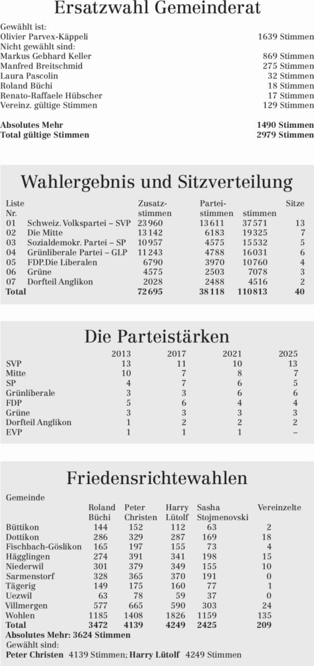 02.12.2025 Wohlen, Wahlen, Politik, ParteienErgebnis-Übersicht zu Einwohnerrat, Gemeinderat, Friedensrichter