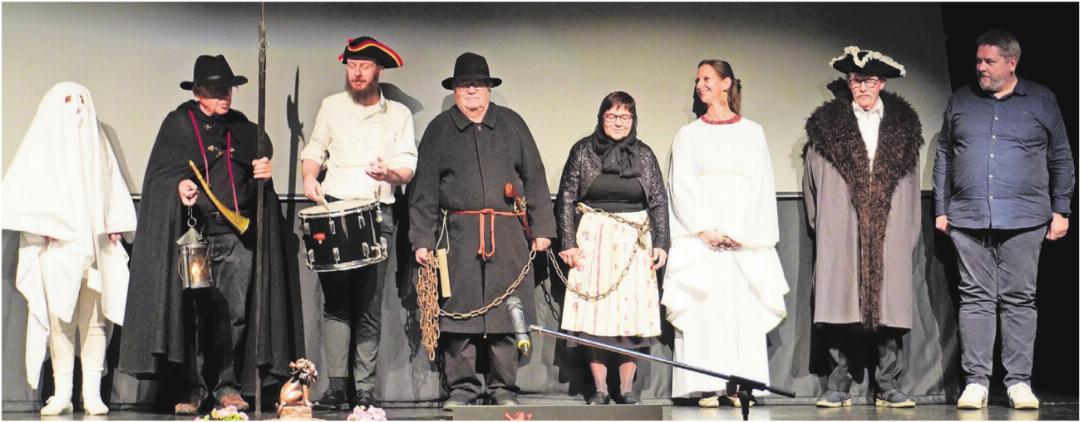 Die Stadtführergruppe revanchierte sich auf der Casinobühne in eindrücklicher theatralischer Kompetenz. Aufgeführt wurde eine schon mal 2017 gespielte Szene um einen geschichtlich verbürgten vom damaligen Berner Landvogt Ulrich von Steiger dem Jüngeren gefällten Gerichtsfall, von Historiker Reto Jäger überarbeitet und mit dem Nachtwächter (Alt-Stadtammann Robert Bamert) und dem Geist der so unglücklich zu Tode gekommenen «Turi Müli» trefflich ergänzt. Und der ging so: An einem fatalen Abend kam es «bim Heiri Notter dehei z Boswil zwüsche em Turi Müli ond em Bölle Trini» zu einem tragischen Raufhandel «vo zwöi Wiiber, sie händ halt zvill gsoffe». Am Schluss «isch s’Turi Müli eifach tot gsii», wie s’Bölle Trini (75) aussagte. «Aber ich bi uuschuldig, ich ha uu Schulde.» Wie war es zum Streit gekommen? s’Bölle Trini: «Sie het mer die Fründ ewegnäh wele.» Der Landjäger, anderntags spät am Tatort eingetroffen, wohl zu Fuss, rapportiert: «Mir händ sie verlochet, sie hät jo nüüt gha, de armi Tropf.» Protokoll: «kes, bruuched mer nüt.» Am 7.7.1777 fällt Landvogt von Steiger in Bremgarten das Urteil: Bölle Trini wird geschlagen, bis ihr Rücken blutet, dann wird sie nach Hause nach Boswil verbannt, sie darf das Dorf nie mehr verlassen und nie mehr eine Beiz und keine Losi besuchen, lebenslang.