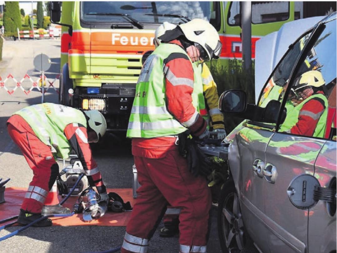 Vermeintlich. Denn kaum hatte Kommandant Felix Hüsser wieder sicheren Boden unter den Füssen, wartete eine nächste Aufgabe auf ihn. Als Figurant setzte er sich in ein demoliertes Auto, das den ganzen Nachmittag in der brütenden Sonne gestanden hatte. Mächtig schwitzend, aber noch immer kommentierend, wartete er auf Rettung. Während die Strassenrettung der Stützpunktfeuerwehr Dietikon ihr schweres Gerät bereitstellte, kroch eine Angehörige der Sanität via Kofferraum zum Unfallopfer und prüfte, ob es bei Bewusstsein und ansprechbar war. Inzwischen versuchte die Strassenrettung mit Spreizer und Schneidegerät, die vordere Tür auf der Fahrerseite so zu bearbeiten, dass man diese letztlich entfernen konnte. Unter dem Applaus der vielen Zusehenden gelang dies vortrefflich und der Kommandant konnte gerettet und der Sanität zur Betreuung übergeben werden.