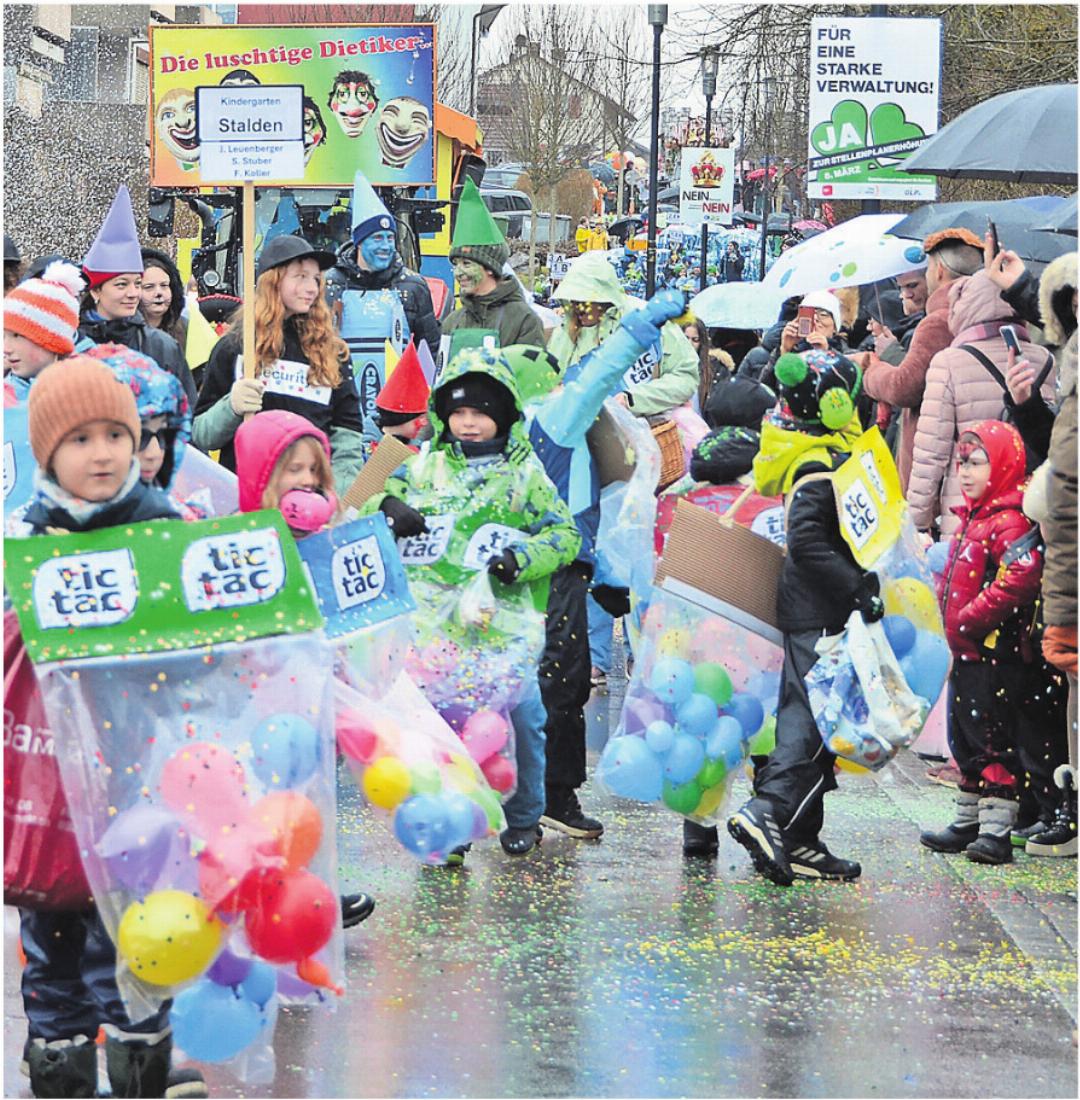 Für den organisierenden Verein «Fasnacht Mutschellen» ist es immer wieder eine Freude, dass die Schule mitmacht. Denn der Umzug ist der Kern der Beriker Fasnacht. Tolles Fasnachtsumzugswetter war zwar nicht, doch trotzdem versammelten sich am Samstag zahlreiche Personen am Strassenrand, um dem buntem Fasnachtstross die Ehre zu erweisen. Und sie wurden belohnt. Was die Lehrerinnen und Lehrer mit ihren Schülern gebastelt haben, konnte sich sehen lassen. Mit viel Fantasie und Detailverliebtheit und einer guten Prise Humor konnte der Fasnachtsnachwuchs überzeugen. Sie verteilten Popcorn oder die obligaten Sugus und warfen mit Konfetti um sich, als ob es kein Morgen gäbe. Dass die Fasnacht den Beriker Kindern Freude macht, ist ohne Zweifel spürbar. Und sie beweisen, dass es an einem Fasnachtsumzug keine Sonne braucht, um zu strahlen. --sab