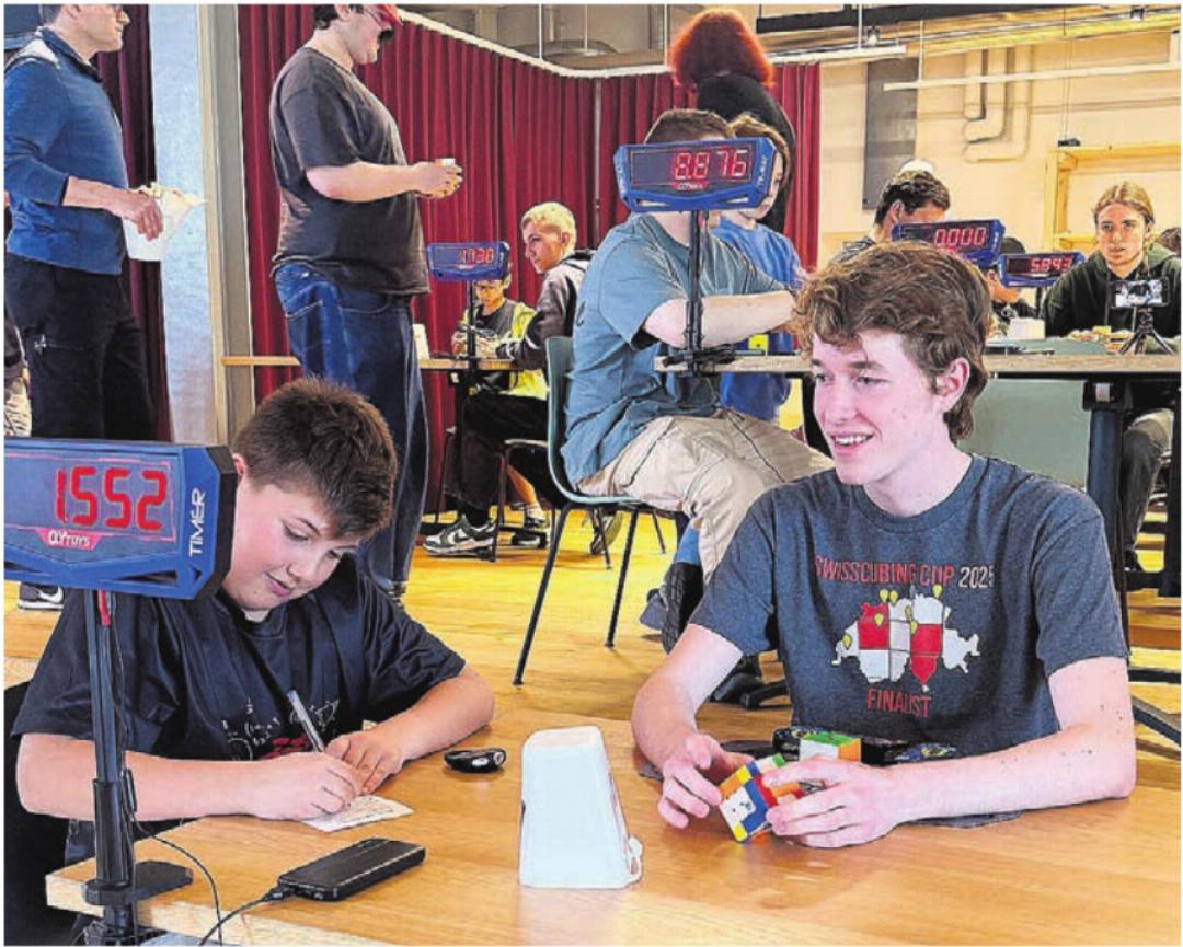 Das fällt schnell auf: Es gibt keinen Unterschied zwischen Alt und Jung. Überall im Raum sitzen Menschen aus der ganzen Schweiz an grossen Tischen und haben etwas gemeinsam: die Leidenschaft für den Zauberwürfel. Zwischen konzentrierten Blicken und geschickten Fingerbewegungen wird geübt, diskutiert und gefachsimpelt. Manche lösen im Sitzen, andere stehen daneben und beobachten. Die Atmosphäre wirkt ruhig und gleichzeitig voller Spannung.